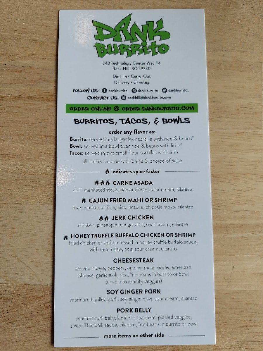 Welcome to Dank Burrito - Rock Hill, your go-to spot for flavor-packed burritos and tantalizing tacos, located at 343 Technology Center Way. Whether you're coming from a nearby event or simply craving a quick and delicious meal, this place delivers an exceptional experience.